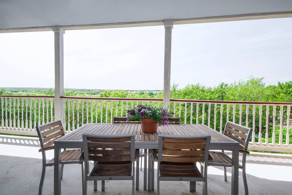 The expansive outdoor patio serves as a generous secondary living area, complete with a dining table and ample seating. From the balcony, you can indulge in breathtaking views of the lush treetops of the Texas Hill Country and the serene Guadalupe River.